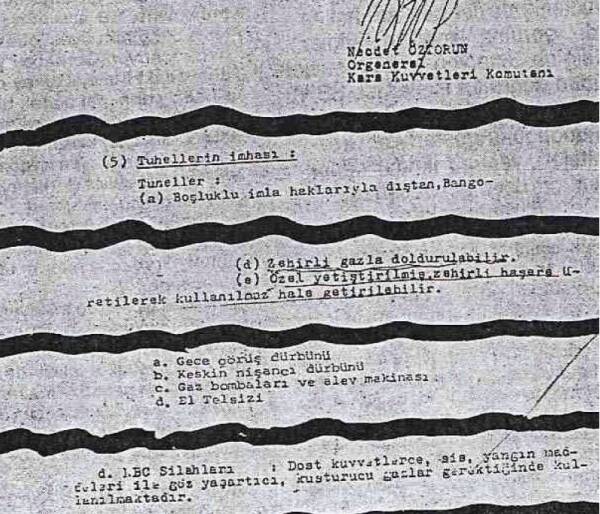 Têkoşînê PKKyî ra dima artêşa tirke kapasîteya xo ya gazanê kîmyewîyan zêdînaye û ferman da ke gazê kîmyewîyî bişuxilîyê. Hêverî 25ê sibata 1986î de Fermandarîya Hêzanê Erdî ya artêşa tirke ferman da ke 'Eke hewce bibo bombaya ke hêsiran virazena û dana viritene wa bişuxilîya' û 'tunelî pê gazê jehrinî bêrê dekerdene.'