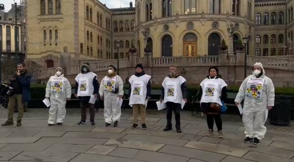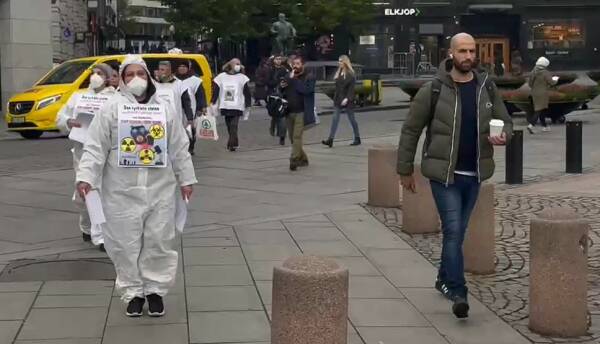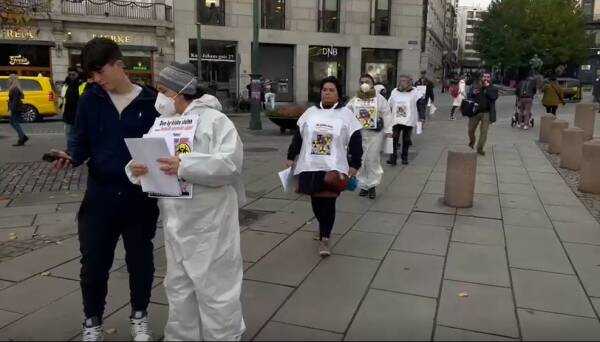 Oslo de çalakwananê ke kincê sipîyî dayî xo ra pê pankart û sloganan verê îstasyonê trenan ê merkezê bajarî ra heta verê parlamentoyî rayra şîyî, vilawekî vila kerdî û bale ante hêrişanê kîmyewîyan û bêvengîya Ewropa ser.